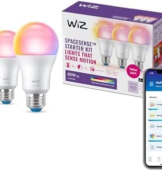 • WiZ Connected Smart Light Bulbs, Sunset to Sunrise Automation + Motion Detection + Control with Voice or App, Full Color A19 60W 800LM Indoor, Matter Compatible -3 Pack